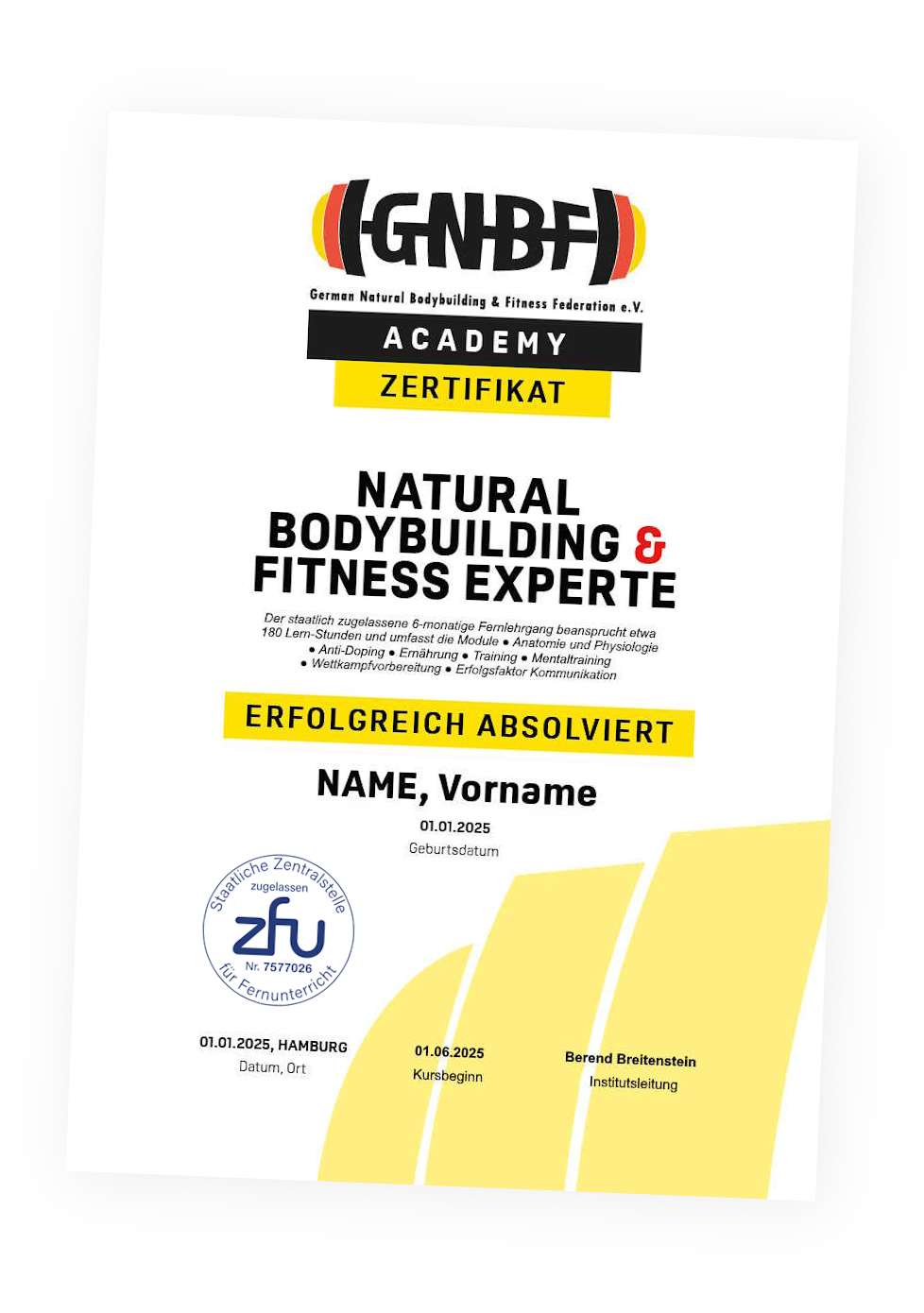 - bei bestandener Abschluss-Prüfung: Zertifikat als „Natural Bodybuilding & Fitness Experte“